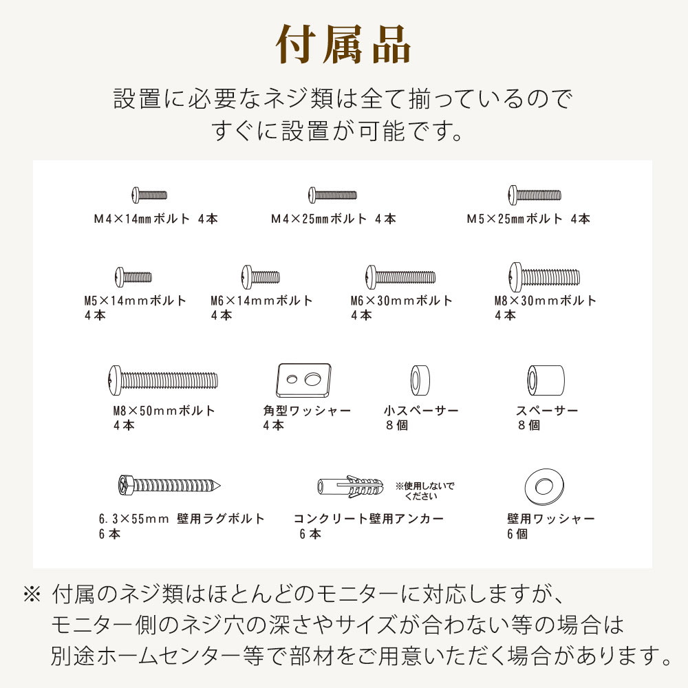 商品には様々な種類のネジ・ビス類が付属しておりますが、 ・テレビ側のネジ穴深さと付属するネジの長さが合わない ・取り付ける壁の材質(例えばコンクリート壁)により付属するビスの使用が適さない 等の理由により、別途ホームセンター等で部材をご用意いただく場合があります。 |