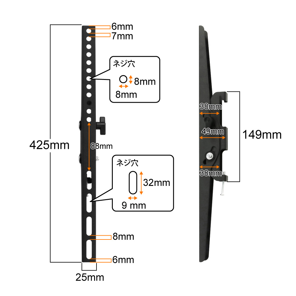 ・テレビ背面にネジ穴があいている事 ・テレビ背面がフラットである事 ・テレビサイズが37~75インチである事 ・テレビ重量が75kg以下である事 ・テレビ背面のネジ穴の間隔が、「縦:100~400mm 横:100~620mm」の範囲内である事 |